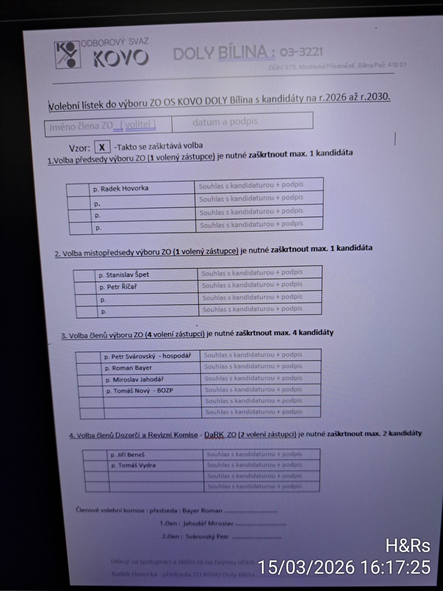 5.3.2026 - Ahoj Kováci, ZO OS KOVO DOLY BÍLINA Vážené kolegyně a kolegové.Vzhledem k tomu, že se blíží konec 4-letého volebního období současně zvolených členů VZO a DaRK, jsem povinen vyhlásit nové volby členů VZO a DaRK. Volby se uskuteční na základě zápisu a usnesení VZO od 21.03.2026 do 30.03.2026 máme před sebou volby do výboru naší základní organizace. Budeme si volit 1 předsedu , 1 místopředsedu, 4 členy výboru a 2 členy DaRK (dozorčí a revizní komise). Pokud chcete někdo kandidovat – odpovězte na tuto zprávu: Jméno a na co chcete kandidovat z těch 4 výše uvedených pozic do 13.3.2026. Pak sestavím kandidátky a zároveň volební lístky, které Vám rozešlu e-mailem , whatsappem , nebo osobně.A pak proběhnou volby. Tuto zprávu dostanou všichni na telefon, whatsapp kovo, e-mail.Díky za spolupráci a těším se na hojnou účast! Ahoj Radek Hovorka předseda ZO KOVO Doly Bílina
